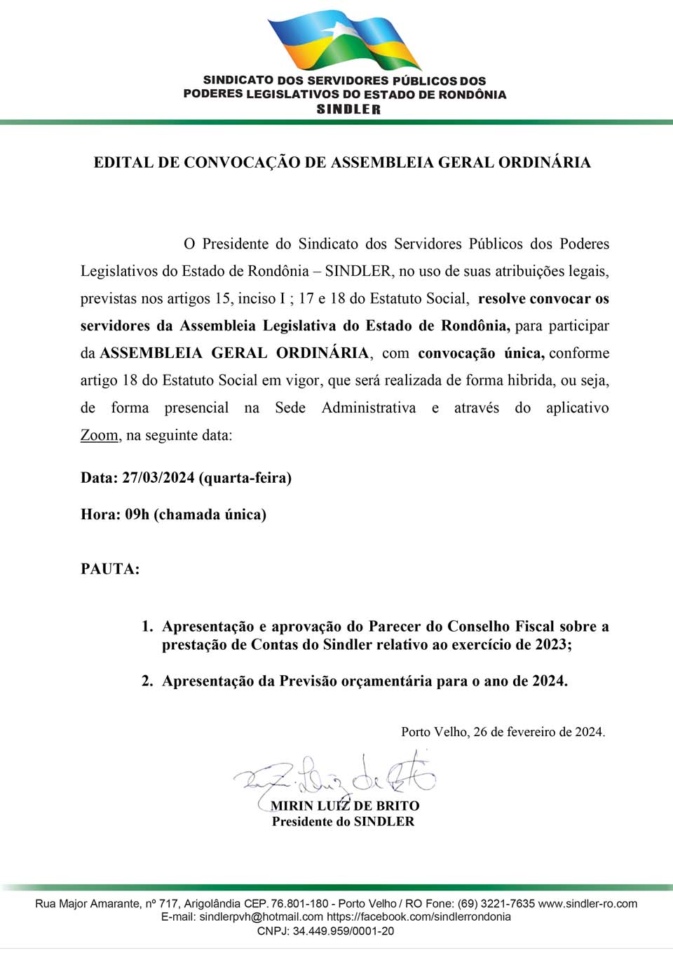 Porto Velho;RO - O presidente do Sindicato dos Servidores Públicos dos Poderes Legislativos do Estado de Rondônia-SINDLER, Mirin Brito, no uso de suas atribuições legais, convoca servidores da Assembleia Legislativa do Estado, para assembleia geral Ordinária, que ocorre de forma híbrida, na próxima quarta-feira (27); Confira as pautas a serem discutidas, conforme edital de Convocação: