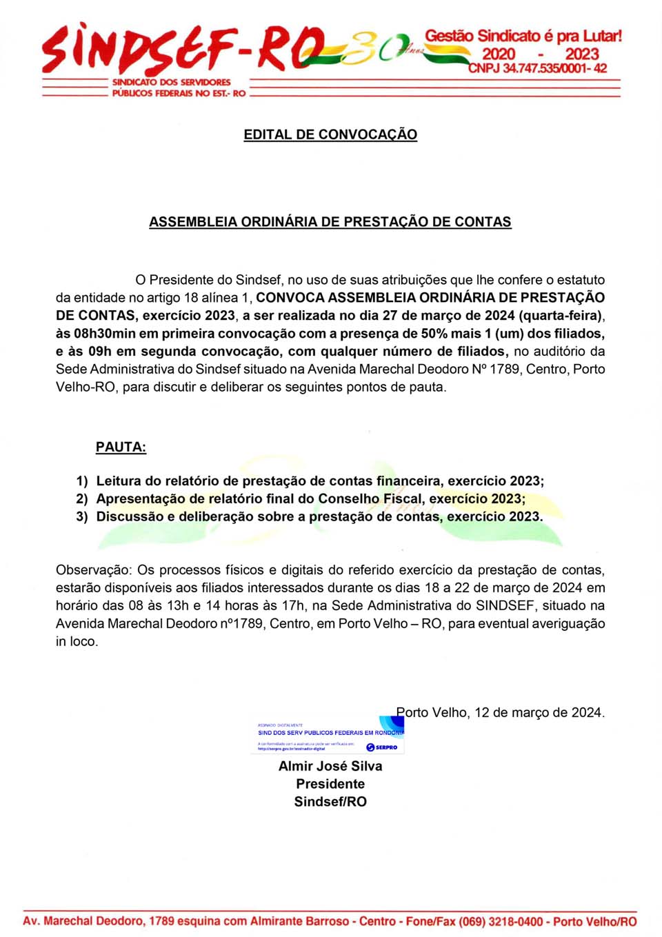 Porto Velho;RO - O presidente do SINDSEF-RO, Almir José Silva, no uso de suas atribuições que lho confere o estatuto da Entidade, convoca Assembleia Ordinária de prestação de Contas, exercício 2023, a ser realizada no próximo dia 27 de março. Cofira a pauta a ser discutida.