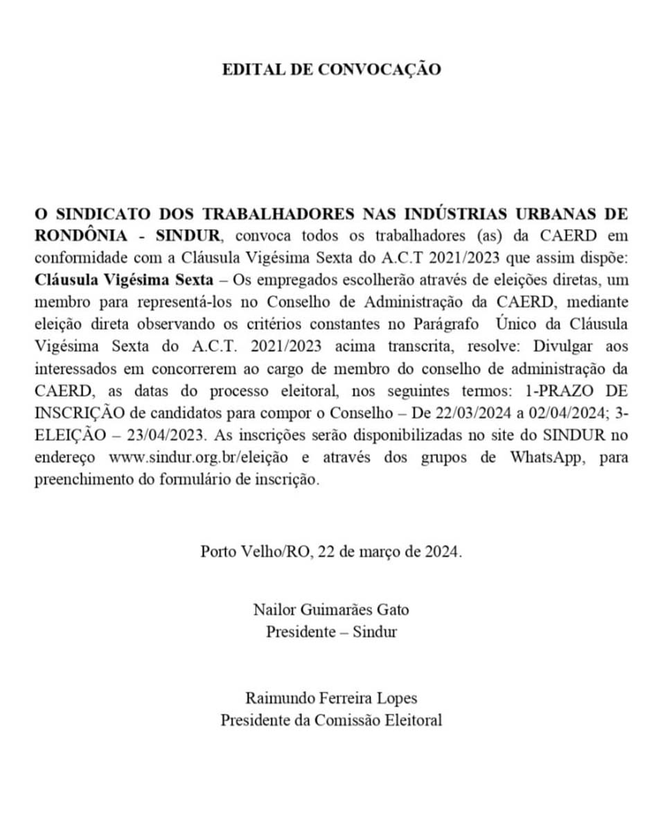 Porto Velho;RO - O Sindicato dos Trabalhadores nas Indústrias Urbanas de Rondônia-SINDUR, convoca todos os trabalhadores(a), da Caerd, para participarem de eleições diretas, um membro para representá-los no Coselho da Caerd; Confira edital de convocação: