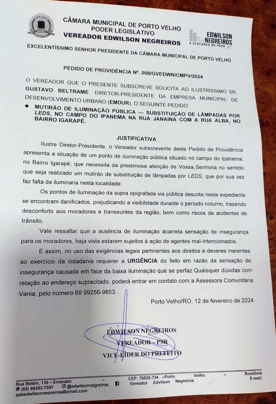 Porto Velho, RO – O vereador Edwilson Negreiros, do PSB, enviou um Pedido de Providência à Empresa Municipal de Desenvolvimento Urbano (EMDUR) de Porto Velho, solicitando um mutirão de iluminação pública no Campo do Ipanema, localizado na Rua Janaína com a via Alba, no Bairro Igarapé. O pedido ressalta a urgência da substituição das lâmpadas por LEDs, visando garantir a segurança e bem-estar dos moradores da região.