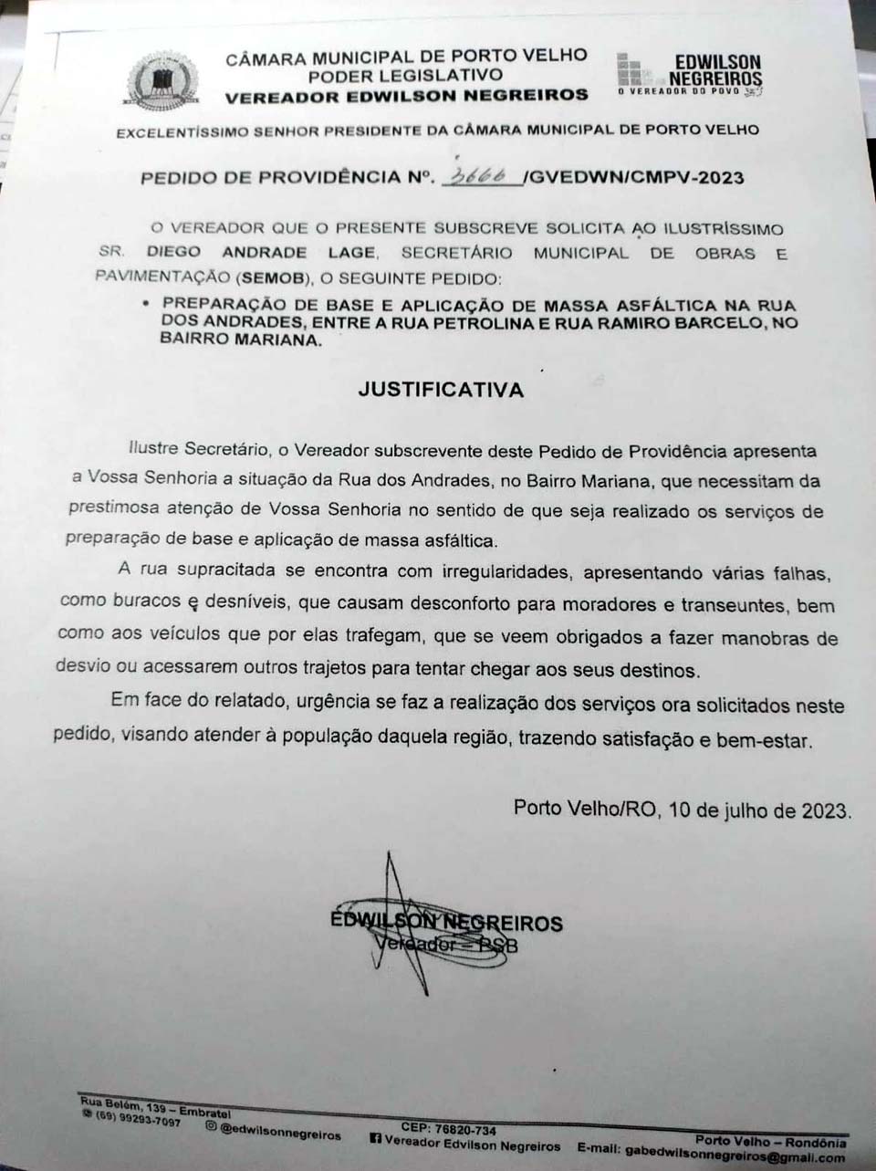 Porto Velho, RO – Um pedido de providência formalizado pelo vereador Edwilson Negreiros solicitando a aplicação de massa asfáltica foi recentemente atendido pela Prefeitura de Porto Velho. A requisição detalha a necessidade de intervenção na Rua dos Andrades, no Bairro Mariana, especificamente entre a Rua Petrolina e a Rua Ramiro Barcelo.