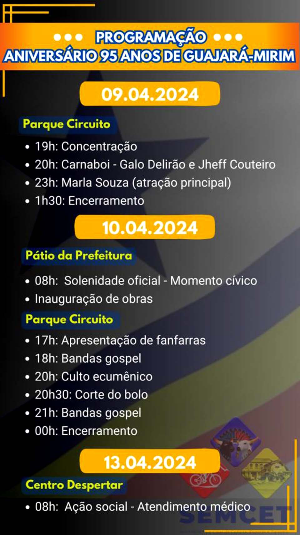 A Prefeitura de Guajará-Mirim-RO, através da Secretaria Municipal de Cultura, Esporte e Turismo (SEMCET), divulgou neste quarta-feira (03.04), o cronograma para as celebrações que irão marcar os 95 anos de emancipação da cidade.