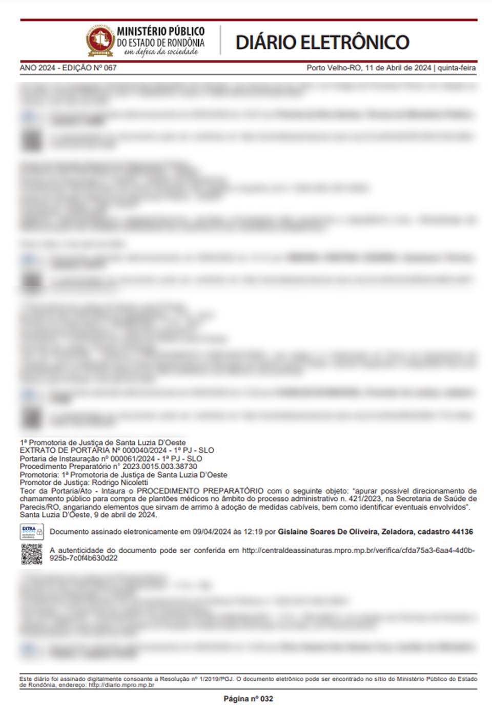 A autenticidade do documento pode ser verificada por meio do link fornecido pelo MP/RO, onde são disponibilizados dados sobre o procedimento instaurado pela 1ª Promotoria de Justiça de Santa Luzia D’Oeste.