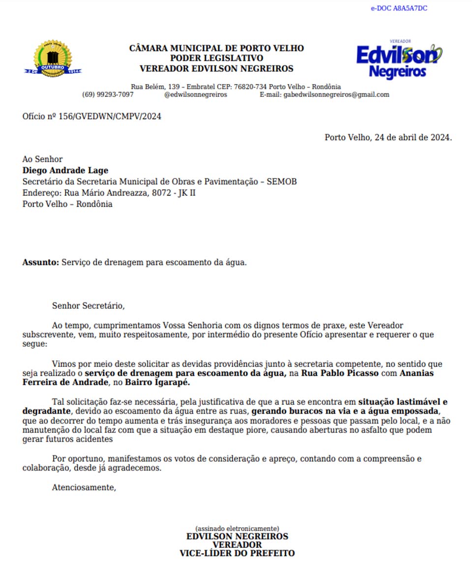 Porto Velho, RO – Em uma demonstração eficaz de representatividade política e atenção às necessidades da população de Porto Velho, o pedido do vereador Edwilson Negreiros para a realização de serviços de drenagem e escoamento de água no Bairro Igarapé foi atendido. O ofício nº 156/GVEDWPN/CMPV/2024, endereçado ao Secretário Municipal de Obras e Pavimentação, Diego Andrade Lage, ressaltou a urgência da situação na Rua Pablo Picasso com Ananias Ferreira de Andrade, onde a água estagnada e buracos na via colocavam em risco a segurança e o bem-estar dos moradores.