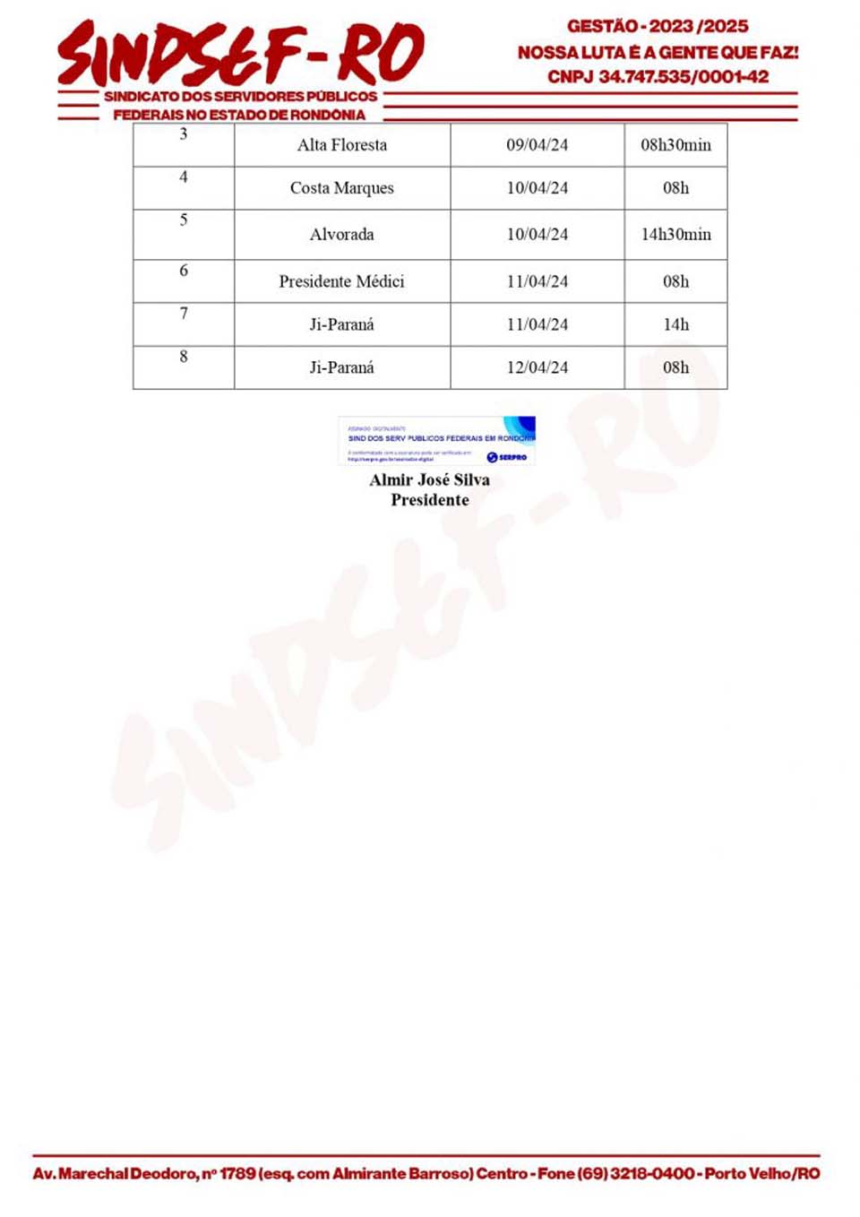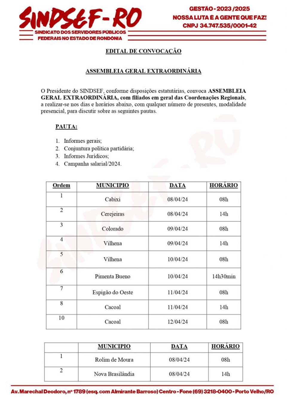 Porto Velho;RO - O Presidente do SINDSEF-RO, Almir José Silva, no uso de suas atribuições estatutárias, convoca assembleias com filiados e filiadas, em 18 Coordenações Regionais; Confira edital e datas:
