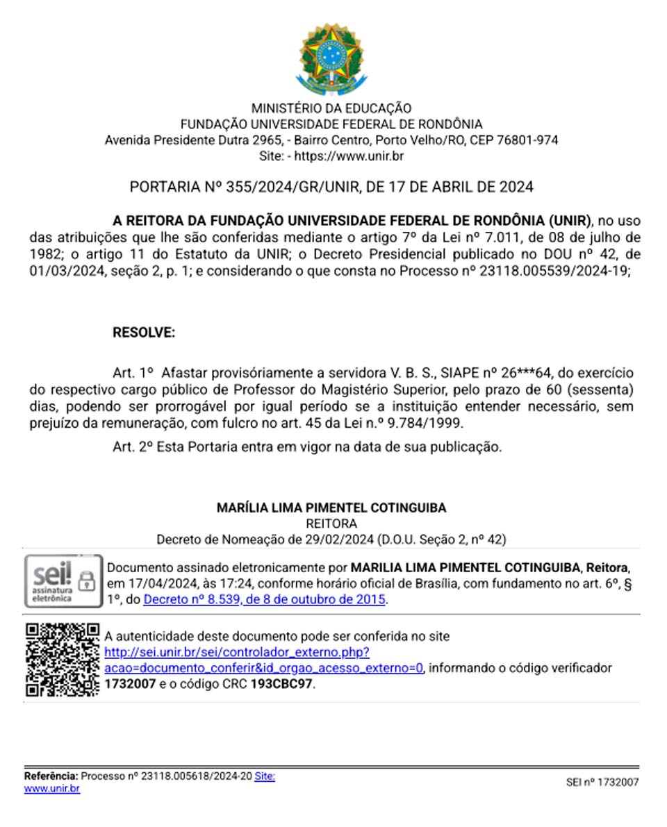 Além disso, foi publicada a Portaria Nº 355/2024/GR/UNIR, datada de 17 de abril de 2024, na qual a Reitora da UNIR, Marília Lima Pimentel Contiguiba, utilizando-se das atribuições legais, decidiu pelo afastamento provisório da vice-reitora renunciante do cargo de Professora do Magistério Superior, pelo período de 60 dias, prorrogável se necessário, sem prejuízo da remuneração.