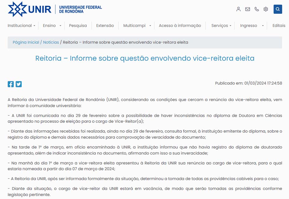 Segundo a Reitoria da UNIR, foi comunicada em 29 de fevereiro sobre possíveis inconsistências no diploma de doutora em Ciências da vice-reitora eleita.