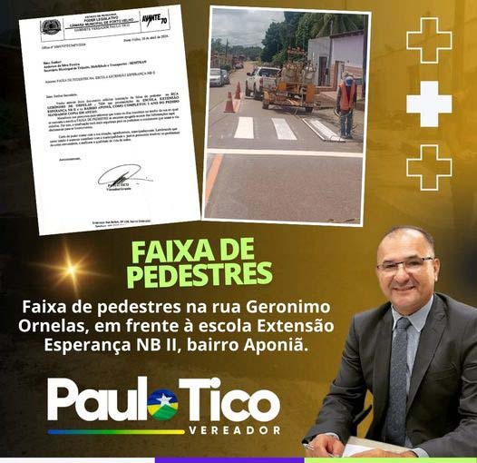 A execução do serviço de melhorias na sinalização e segurança na trafegabilidade nas vias do bairro, foi um pedido do Verador Paulo Tico. Solicitação que chegou ao gabinete do vereador por meio dos moradores da comunidade local.