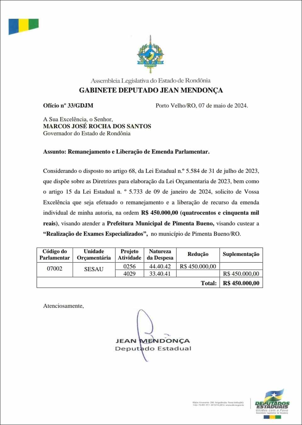 O deputado Jean Mendonça, do PL, protocolou ofício dirigido ao governo de Rondônia, solicitando o remanejamento e a liberação de uma emenda parlamentar individual no valor de R$ 450 mil. O objetivo é custear a realização de exames especializados no município de Pimenta Bueno, atendendo a uma solicitação daquela prefeitura.