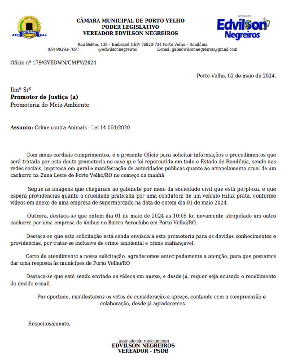 Porto Velho, RO – Em 2 de maio de 2024, o vereador Edwilson Negreiros, do PSB, membro da Câmara Municipal de Porto Velho, enviou um ofício ao promotor de Justiça do Meio Ambiente solicitando informações e procedimentos em relação a um caso de atropelamento de um cachorro.