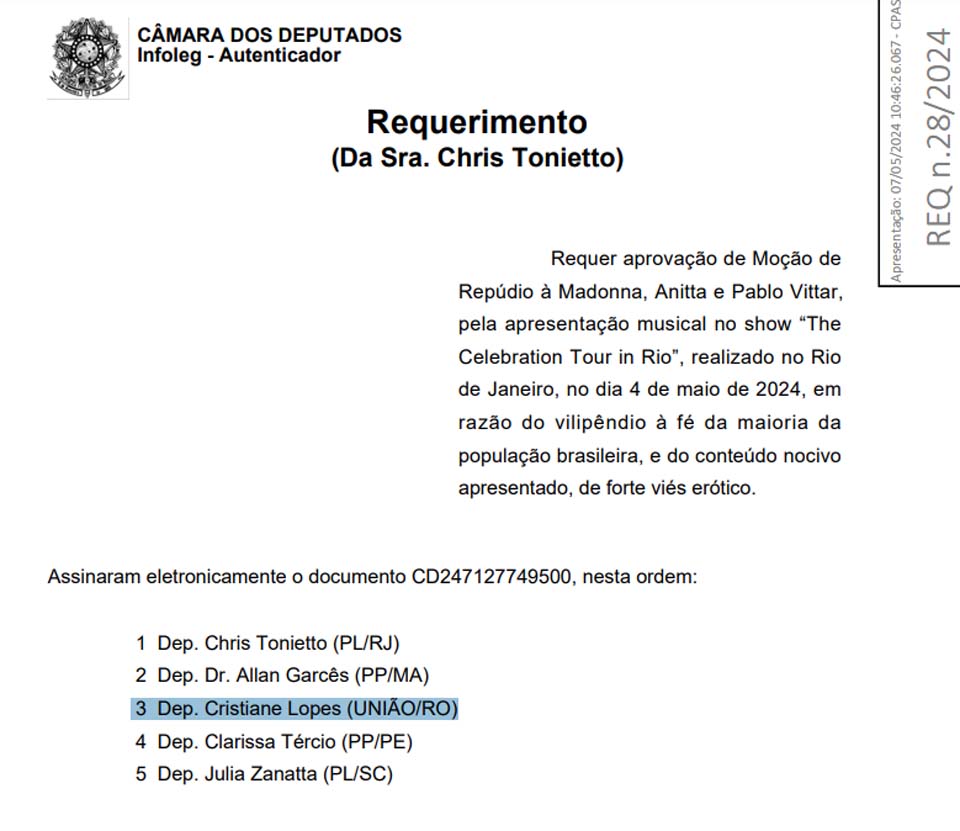 Enquanto isso, em outro espectro completamente diferente do absurdo político, a deputada Cristiane Lopes (UNIÃO/RO) dirigiu suas energias para uma Moção de Repúdio contra Madonna, Anitta e Pablo Vittar, por uma performance no Rio de Janeiro, que ela descreveu como um insulto à fé cristã predominante no Brasil e um espetáculo de "forte viés erótico". A ironia não poderia ser mais amarga quando consideramos que, ao mesmo tempo em que grandes áreas da Amazônia enfrentam o risco de extinção, preocupações morais sobre apresentações pop ocupam o tempo legislativo.