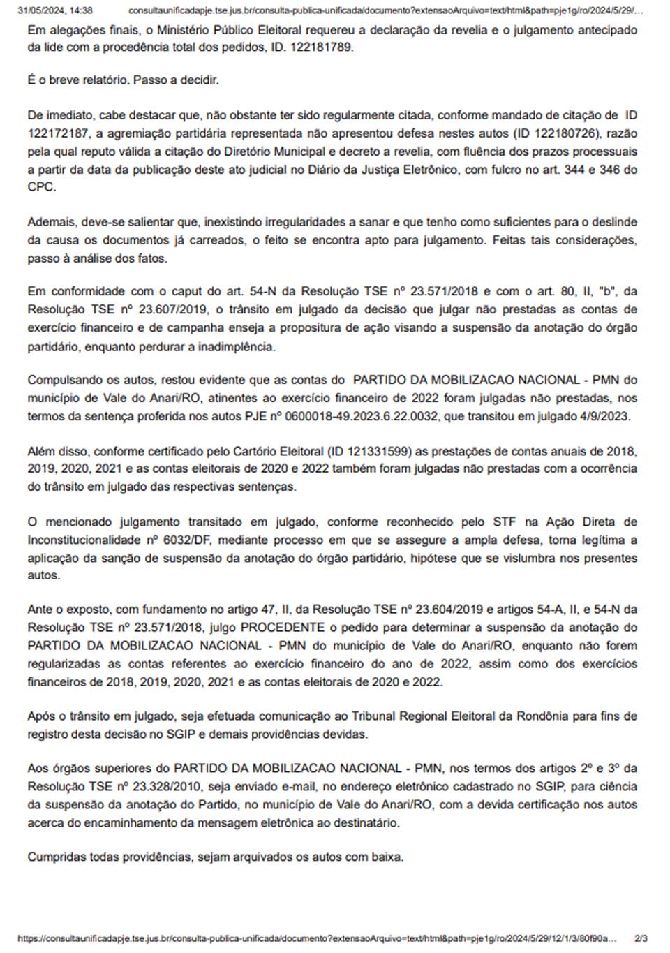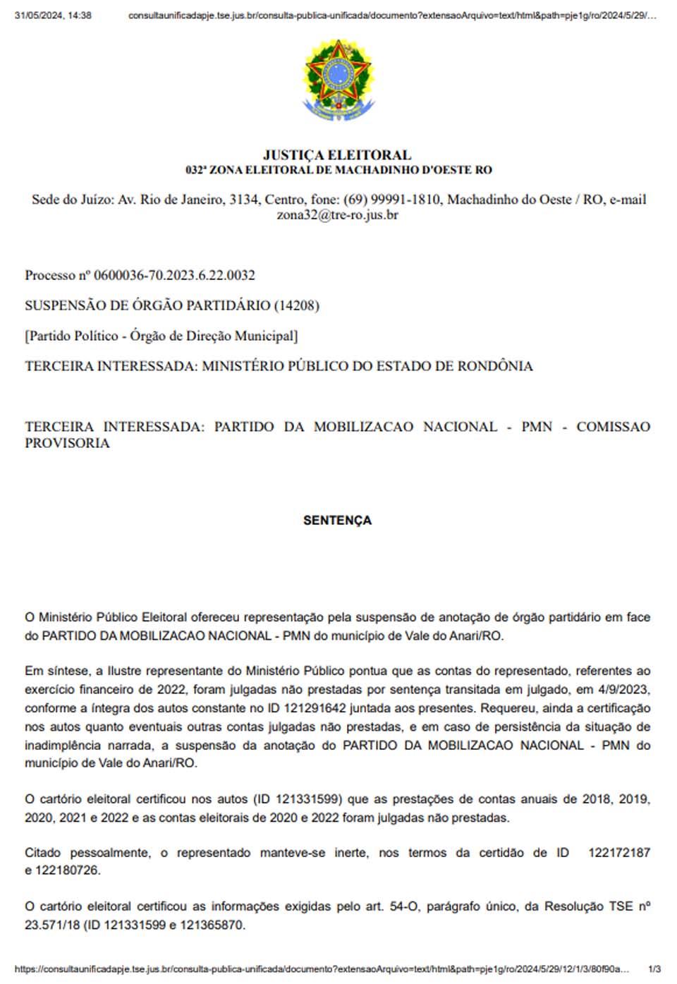 Porto Velho, RO – A Justiça Eleitoral da 32ª Zona Eleitoral de Machadinho d'Oeste, Rondônia, determinou a suspensão da anotação do Partido da Mobilização Nacional (PMN) no município de Vale do Anari/RO. A decisão foi proferida pelo juiz eleitoral Matheus Brito Nunes Diniz, em processo que teve origem na representação do Ministério Público Eleitoral.