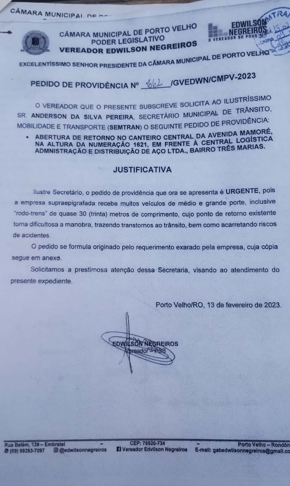 O documento especificava a necessidade urgente de abrir um retorno no canteiro central da Avenida Mamoré, em frente à Central Logística Administração e Distribuição de Aço Ltda., no bairro Três Marias. A medida foi solicitada para facilitar a manobra de veículos de médio e grande porte, incluindo "rodo-trens" de aproximadamente 30 metros de comprimento, que anteriormente enfrentavam dificuldades devido ao ponto de retorno existente, pequeno e inadequado para o fluxo.