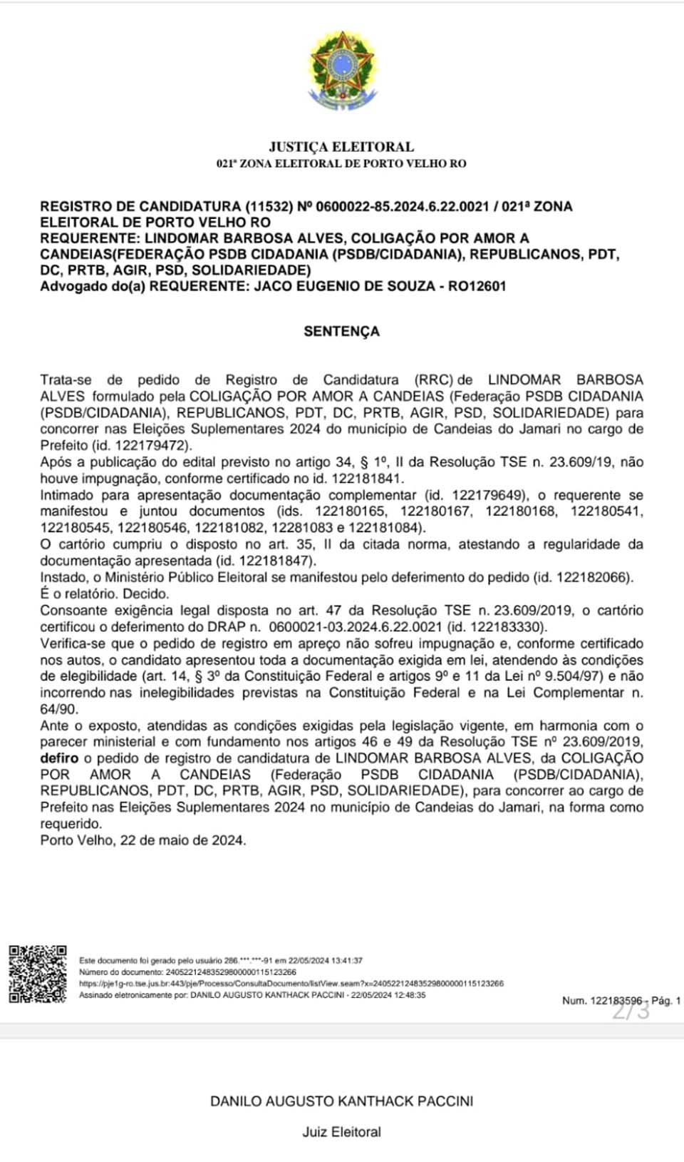 Porto Velho, RO – O Tribunal Regional Eleitoral de Rondônia (TRE/RO) deferiu a candidatura de Lindomar Garçon para concorrer à Prefeitura de Candeias do Jamari nas eleições suplementares de 2024. A decisão judicial, emitida em 22 de maio de 2024, foi proferida pela 21ª Zona Eleitoral de Porto Velho, confirmando a regularidade da candidatura apresentada pela coligação "Por Amor a Candeias".