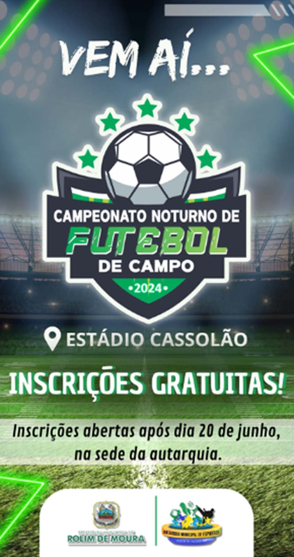 Roliom de Moura;RO - A prefeitura de Rolim de Moura informa que estão abertas as inscrições para o Campeonato Noturno de Futebol de Campo em Rolim de Moura. O evento ocorre no estádio Cassolão e os interessados podem se inscrever até o próximo dia 20.