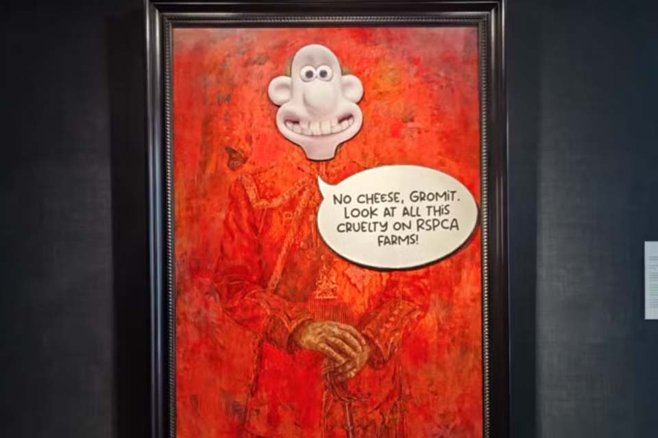 Uma mensagem foi colada no quadro dizendo: "Sem queijo, Gromit. Veja toda essa crueldade nas fazendas da RSPCA".