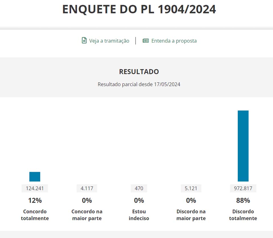 Em uma enquete realizada no site da Câmara dos Deputados, 88% dos participantes, totalizando 972.817 votos, expressaram discordância total com a proposta legislativa. Em contrapartida, apenas 12% dos votantes, representando 124.241 pessoas, manifestaram apoio ao projeto.