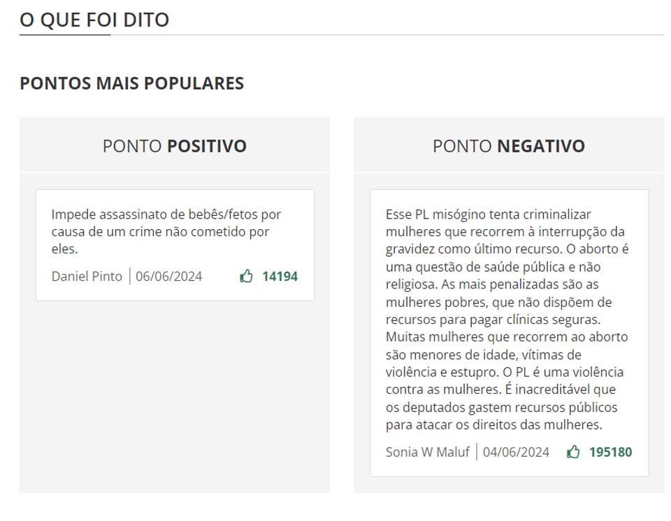 Por outro lado, a crítica mais referenciada foi feita por Sonia Maluf, endossada por 195.180 pessoas. Ela escreveu: “Esse PL misógino tenta criminalizar mulheres que recorrem à interrupção da gravidez como último recurso. O aborto é uma questão de saúde pública e não religiosa. As mais penalizadas são as mulheres pobres, que não dispõem de recursos para pagar clínicas seguras. Muitas mulheres que recorrem ao aborto são menores de idade, vítimas de violência e estupro. O PL é uma violência contra as mulheres. É inacreditável que os deputados gastem recursos públicos para atacar os direitos das mulheres”.