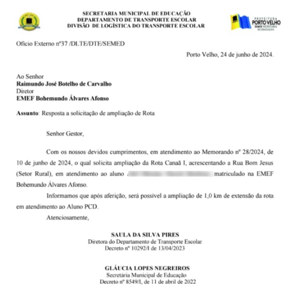Em resposta ao ofício do vereador, a SEMED, através da Secretaria Municipal de Educação (SEMED), confirmou a viabilidade do ajuste solicitado. No ofício nº 37/DLTE/DTE/SEMED, datado de 24 de junho de 2024, a diretora do Departamento de Transporte Escolar, Saula da Silva Pires, informou que, após aferição, seria possível a ampliação de 1,0 km de extensão da rota, incluindo a Rua Bom Jesus, para atendimento ao aluno PCD (Pessoa com Deficiência).