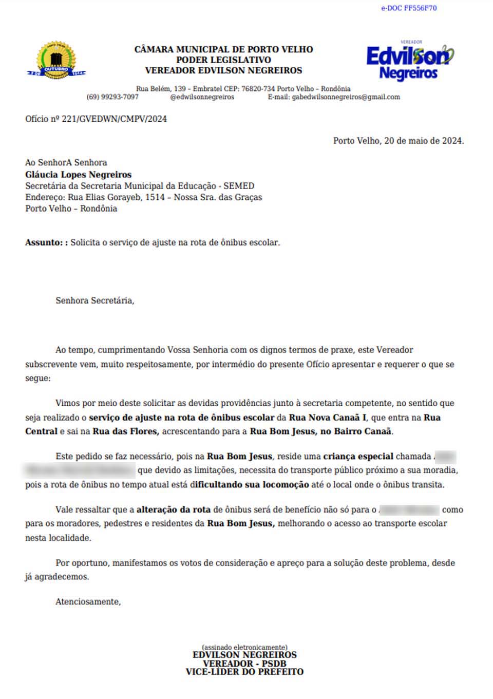 Porto Velho, RO – O vereador Edwilson Negreiros, do PSDB, encaminhou um pedido de providências à Secretaria Municipal de Educação (SEMED) de Porto Velho, solicitando um ajuste na rota de ônibus escolar. O pedido foi feito através do ofício nº 221/GVEDWN/CMPV/2024, datado de 20 de maio de 2024, e visava incluir a Rua Bom Jesus, no Bairro Canaã, na rota de ônibus escolar, para atender especificamente um aluno matriculado na EMEF Bohemundo Álvares Afonso.