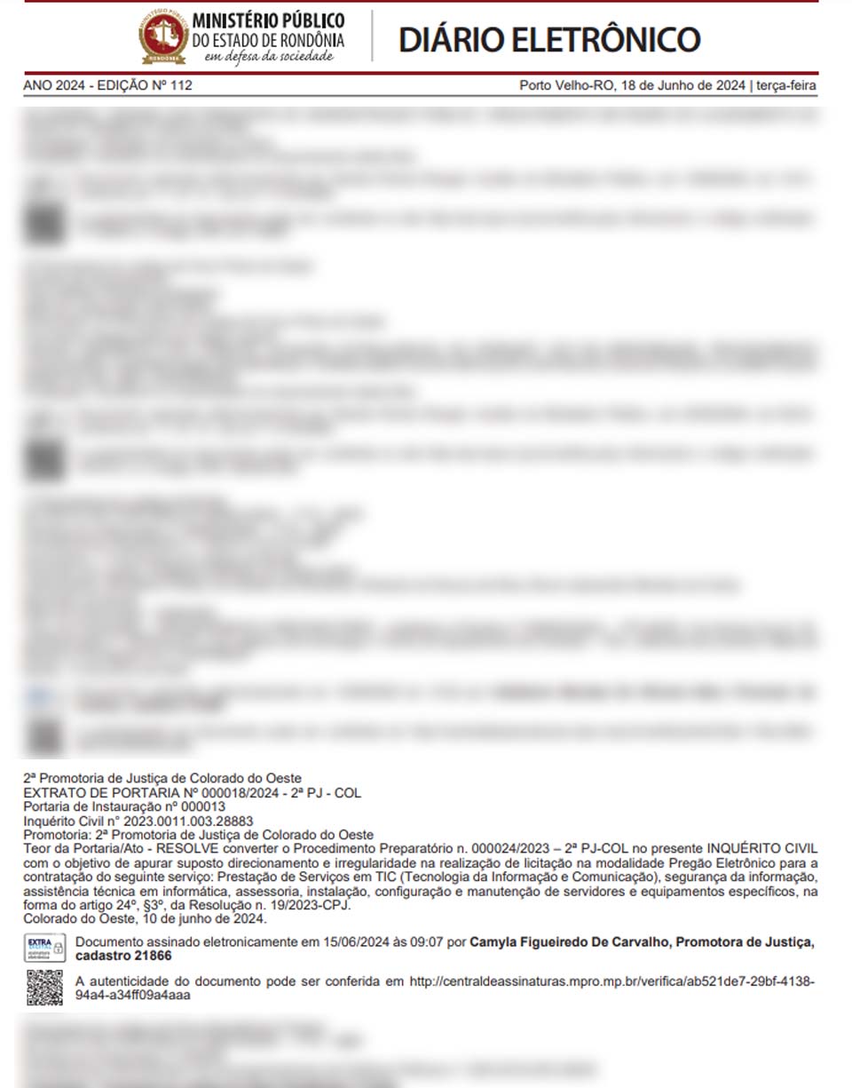 Porto Velho, RO – A 2ª Promotoria de Justiça de Colorado do Oeste, através da Portaria de Instauração nº 000013, converteu o Procedimento Preparatório n. 000024/2023 no Inquérito Civil n° 2023.0011.003.28883, visando investigar suposto direcionamento e irregularidades em uma licitação na modalidade Pregão Eletrônico.
