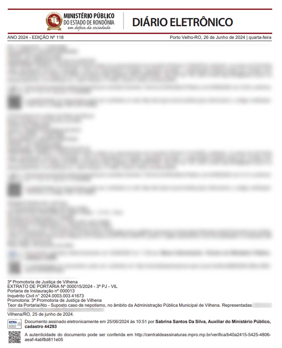 Porto Velho, RO – A 3ª Promotoria de Justiça de Vilhena anunciou a instauração de um inquérito civil para investigar um suposto caso de nepotismo na Administração Pública Municipal de Vilhena.