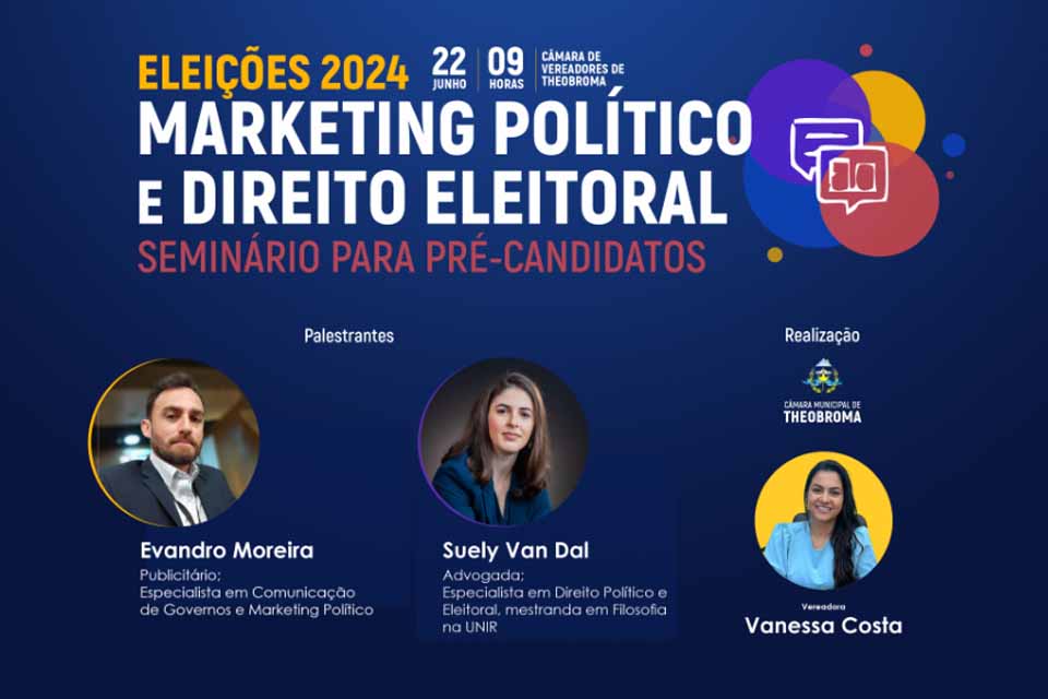 A Câmara de Vereadores de Theobroma, por iniciativa da Vereadora Vanessa Costa (PL), está organizando um seminário gratuito intitulado "Eleições 2024 - Marketing Político e Direito Eleitoral". O evento, aberto a todos os pré-candidatos, acadêmicos e demais interessados no tema, ocorrerá no dia 22 de junho de 2024, das 9h às 12h, na própria Câmara de Vereadores de Theobroma.