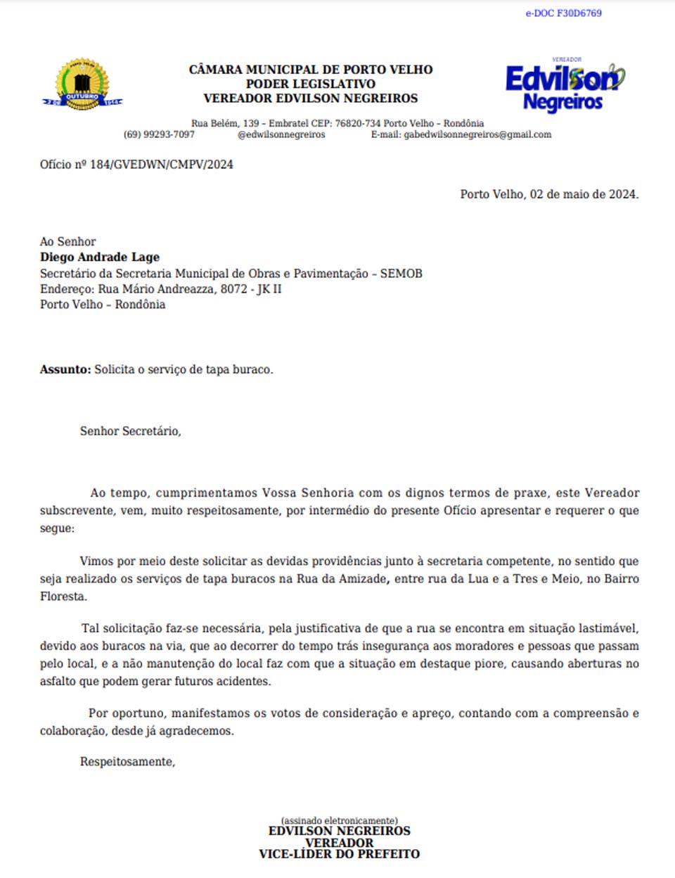 Porto Velho, RO – O vereador Edwilson Negreiros, do PSDB, encaminhou no dia 2 de maio de 2024 um ofício ao Secretário da Secretaria Municipal de Obras e Pavimentação (SEMOB), Diego Andrade Lage, solicitando a realização do serviço de tapa buracos na Rua da Amizade, situada entre a Rua da Lua e a Rua Três e Meio, no Bairro Floresta.
