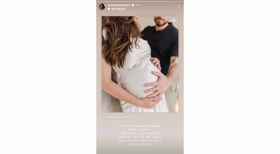 A atriz Bruna Marquezine, de 28 anos, compartilhou nas redes sociais, nesta terça-feira (3), a emoção que sentiu ao ver o ensaio de gestante da amiga e empresária Juliana Montesanti, que espera a primeira filha com o marido, Marcelo Borges. A neném se chamará Antonia e foi carinhosamente apelidada de Tota.