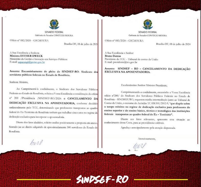 "O Sindsef e os professores aguardam ansiosamente o retorno da comunicação e reiteram a solicitação ao senador Confúcio Moura para que intensifique a cobrança junto ao TCU e MGI para atender ao pleito dos professores referente a incorporação do regime de Dedicação Exclusiva", ressalta o .