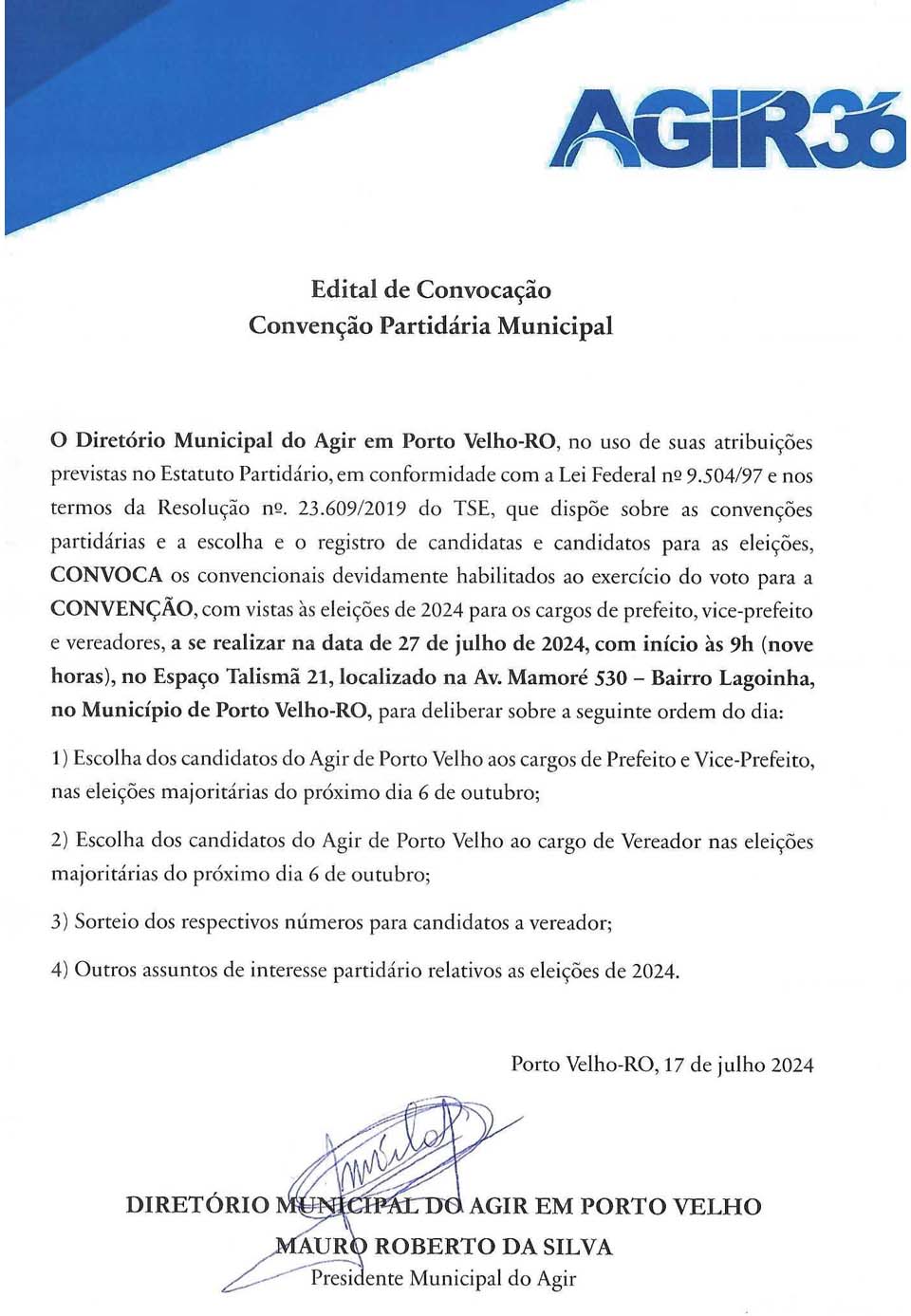 Edital de Convocação - Convenção Partidária Municipal do AGIR