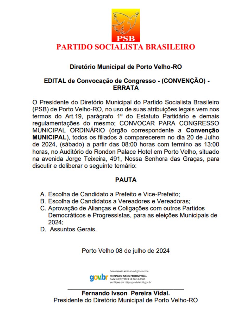 Todos os filiados ao PSB estão convocados a comparecer ao evento para discutir e deliberar sobre os pontos mencionados. O edital de convocação foi divulgado no dia 08 de julho de 2024 e assinado digitalmente por Fernando Ivson Pereira Vidal.