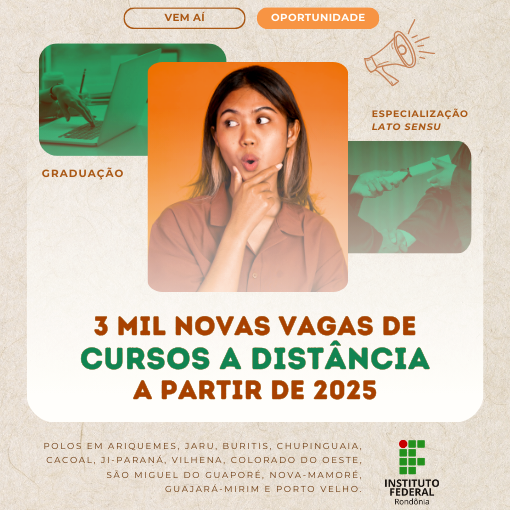 O Instituto Federal de Educação, Ciência e Tecnologia de Rondônia (IFRO) obteve a aprovação de 3 mil vagas para cursos na modalidade de Educação a Distância (EaD). A conquista ocorreu por meio do Edital nº 25/2023, da Coordenação de Aperfeiçoamento de Pessoal de Nível Superior (Capes), e permitirá ao IFRO ampliar sua oferta de cursos de graduação e de pós-graduação a partir do próximo ano.