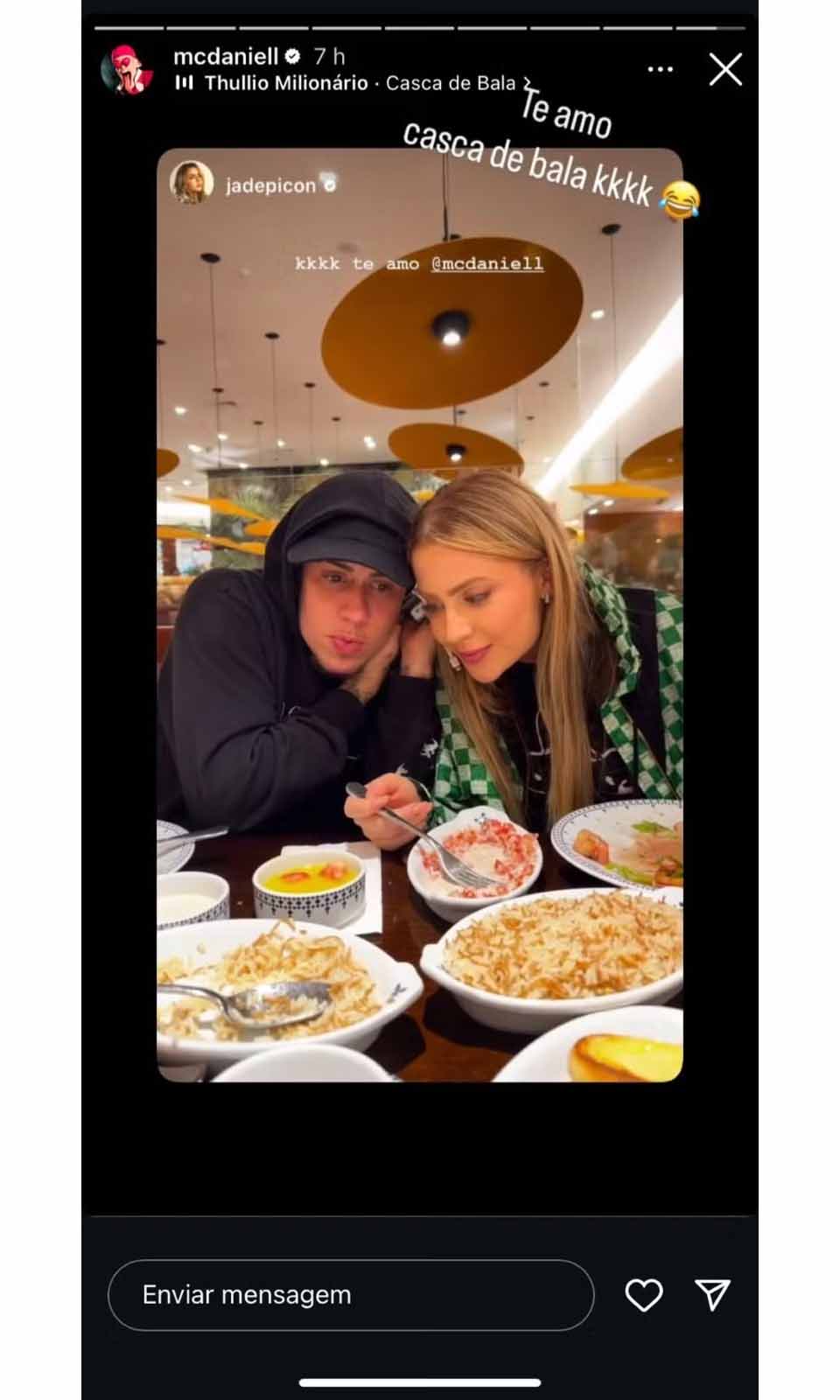 Jade Picon já deixou claro o carinho que sente pelo cantor MC Daniel. Os dois foram jantar juntos nesta quarta-feira (10) e a influenciadora compartilhou um registro ao lado do funkeiro, declarando seu amor por ele.