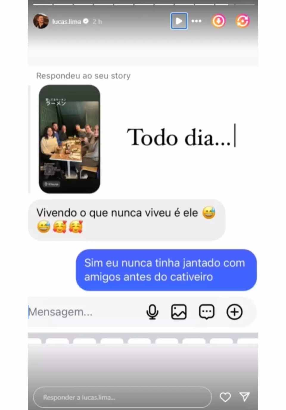 "Vivendo o que nunca viveu é ele", disparou uma seguidora. Rapidamente, em tom de deboche, o músico rebateu: "Sim, eu nunca tinha jantado com amigos antes do cativeiro". E ainda escreveu 'todo dia…', referindo-se ao fato de receber com frequência esse tipo de mensagem.