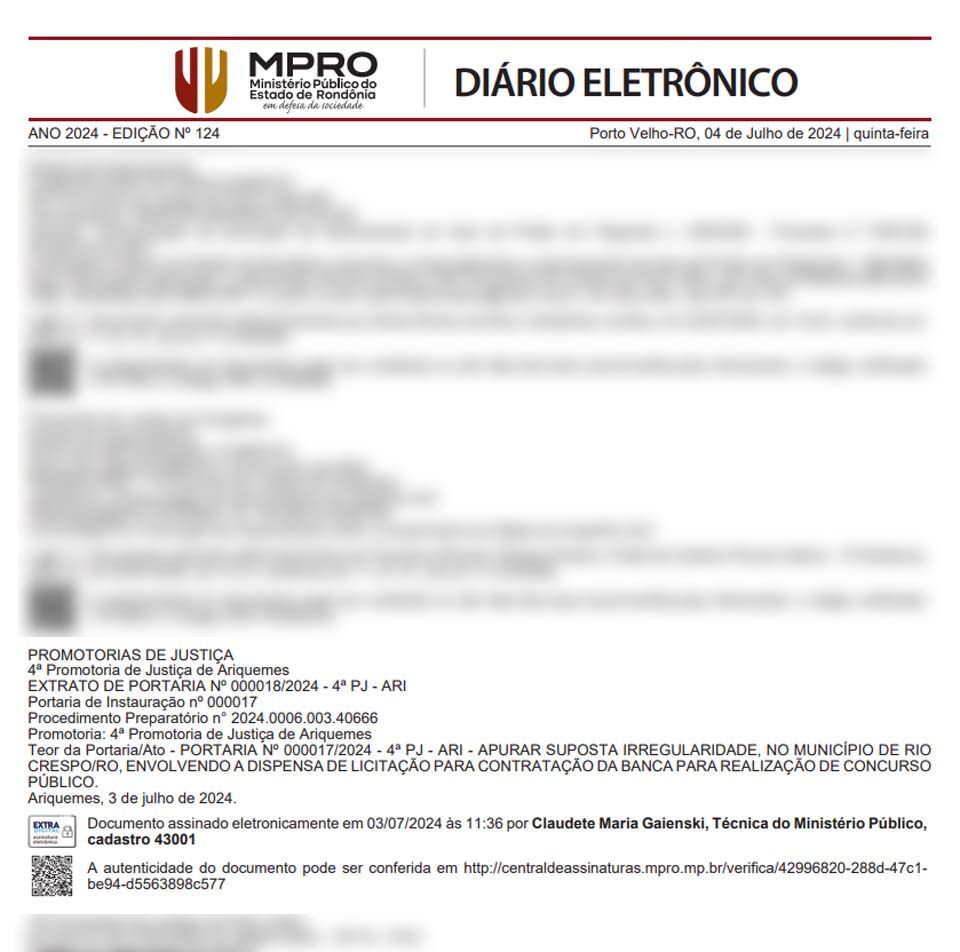 A portaria de instauração, de número 000017/2024, foi emitida em 3 de julho de 2024. O extrato do documento que oficializa o início das investigações foi assinado eletronicamente por uma técnica do Ministério Público. A autenticidade da assinatura pode ser verificada através do portal do Ministério Público de Rondônia.