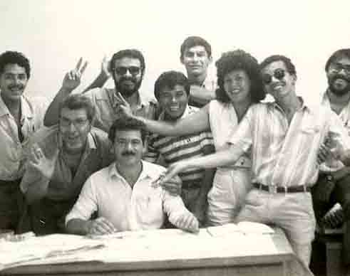 Na foto, ainda na sede da “Duque”, a equipe comandada por Antonio Queiroz (sentado). Da esq/dir: Rubens Nascimento, Robson Oliveira; Águido Melo, Ronaldo Affonso, Jorcêne Martínez, Mara Paraguassu, diagramador Paulo e Carlos Araújo.