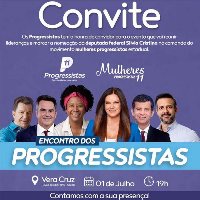 Presenças confirmadas do presidente nacional do Progressistas, o senador Ciro Nogueira, o presidente estadual, o ex-governador Ivo Cassol, o deputado federal e líder do partido na Câmara Federal, Dr. Luizinho, o deputado estadual Lucas Torres, a presidente nacional do Mulheres Progressistas, Iracema Portella, entre outras lideranças do partido.