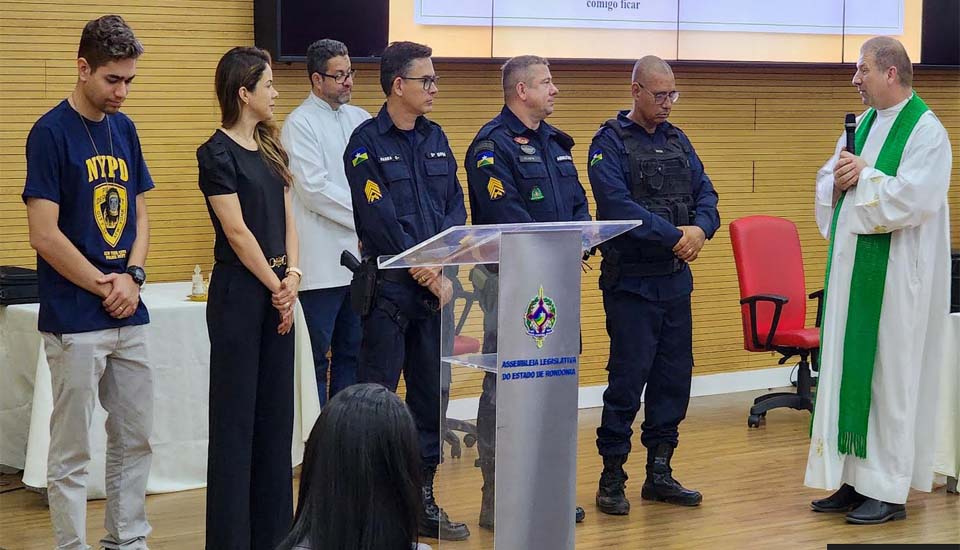 A celebração da missa desta segunda-feira, 19, na Assembleia Legislativa contou com a presença de servidores da segurança pública de Rondônia, destacados pela homilia do Padre Magnos Caneppele, que pediu proteção a todos os policiais militares, policiais civis, policiais federais e policiais penais que atuam em Rondônia. O padre lembrou do momento difícil que vive a segurança pública no estado de Rondônia e em todo o Brasil e pediu proteção aos profissionais de segurança para que consigam desenvolver o seu trabalho, garantindo a proteção da população.