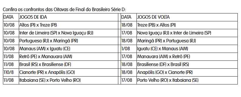 A CBF confirmou que os jogos das Oitavas de Final do Campeonato Brasileiro Série D acontecem nos dois próximos finais de semana. De acordo com a entidade que comanda o futebol no Brasil, nos dias 10 e 11 de agosto acontecem os jogos de ida, e nos dias 17 e 18 as partidas de volta.
