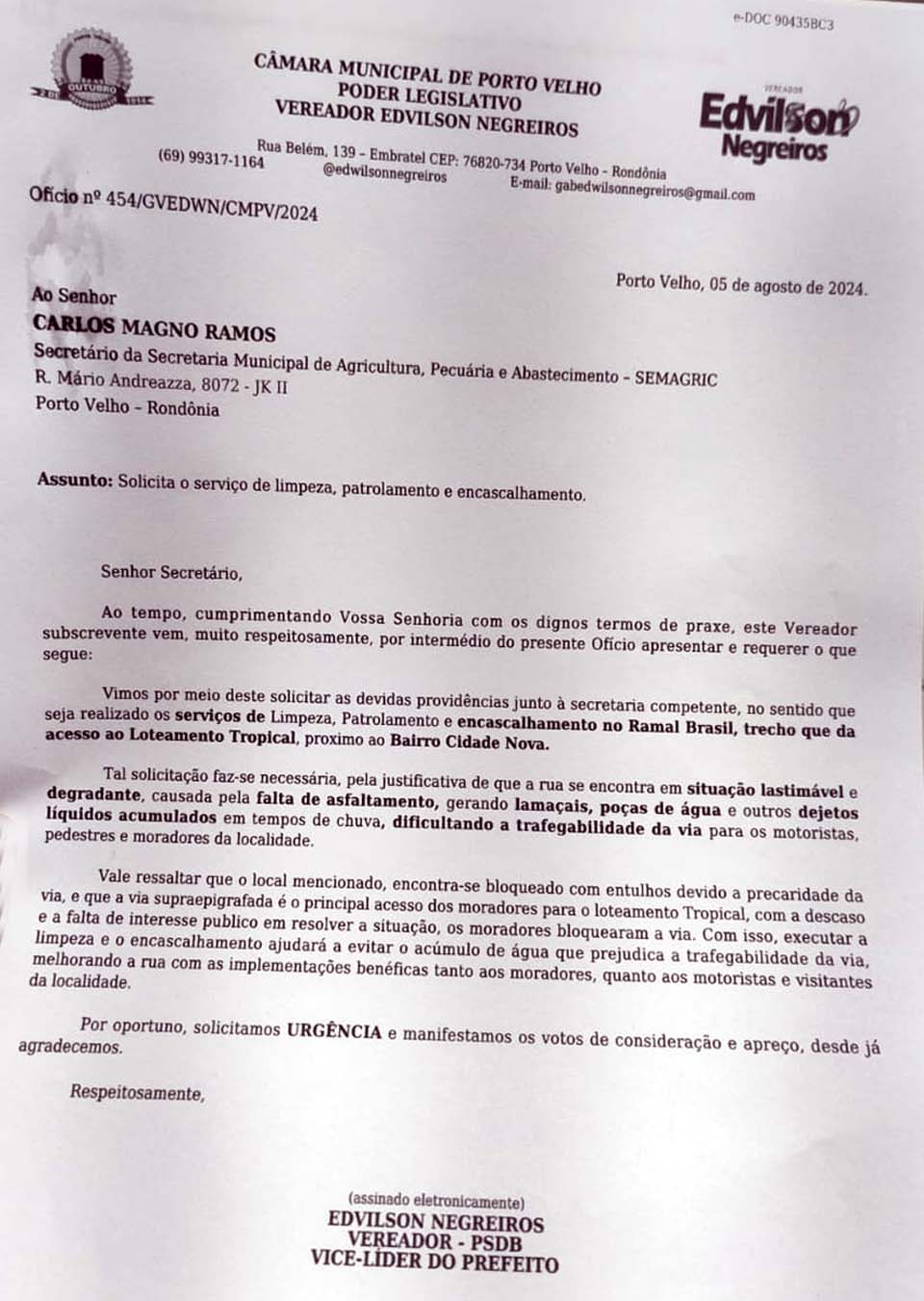 Porto Velho, RO – O vereador Edwilson Negreiros (PSDB) encaminhou um ofício à Secretaria Municipal de Agricultura, Pecuária e Abastecimento (SEMAGRIC) de Porto Velho solicitando a realização urgente de serviços de limpeza, patrolamento e encascalhamento no Ramal Brasil, especificamente no trecho que dá acesso ao Loteamento Tropical, próximo ao Bairro Cidade Nova. O serviço já foi feito.