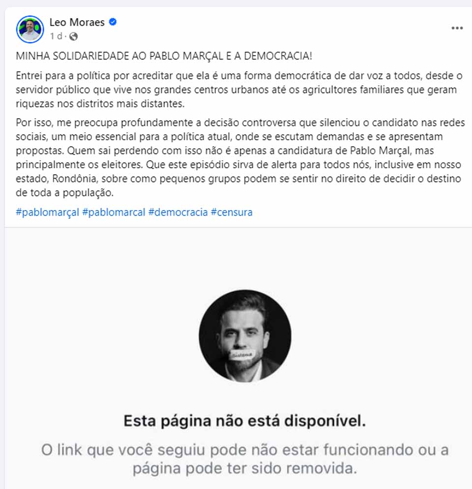 Por isso, me preocupa profundamente a decisão controversa que silenciou o candidato nas redes sociais, um meio essencial para a política atual, onde se escutam demandas e se apresentam propostas. Quem sai perdendo com isso não é apenas a candidatura de Pablo Marçal, mas principalmente os eleitores. Que este episódio sirva de alerta para todos nós, inclusive em nosso estado, Rondônia, sobre como pequenos grupos podem se sentir no direito de decidir o destino de toda a população."