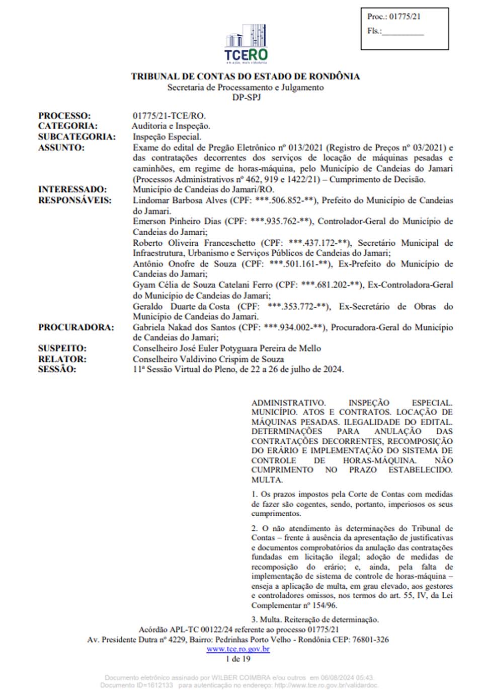 O acórdão do Tribunal de Contas também incluiu determinações específicas destinadas ao prefeito atual de Candeias do Jamari, Lindomar Barbosa Alves. Entre as medidas impostas, está a necessidade de anulação dos contratos ilegais oriundos do Pregão Eletrônico nº 013/2021. Além disso, foi exigida a recomposição do erário devido ao pagamento irregular das despesas relacionadas aos serviços de locação de máquinas pesadas e caminhões.