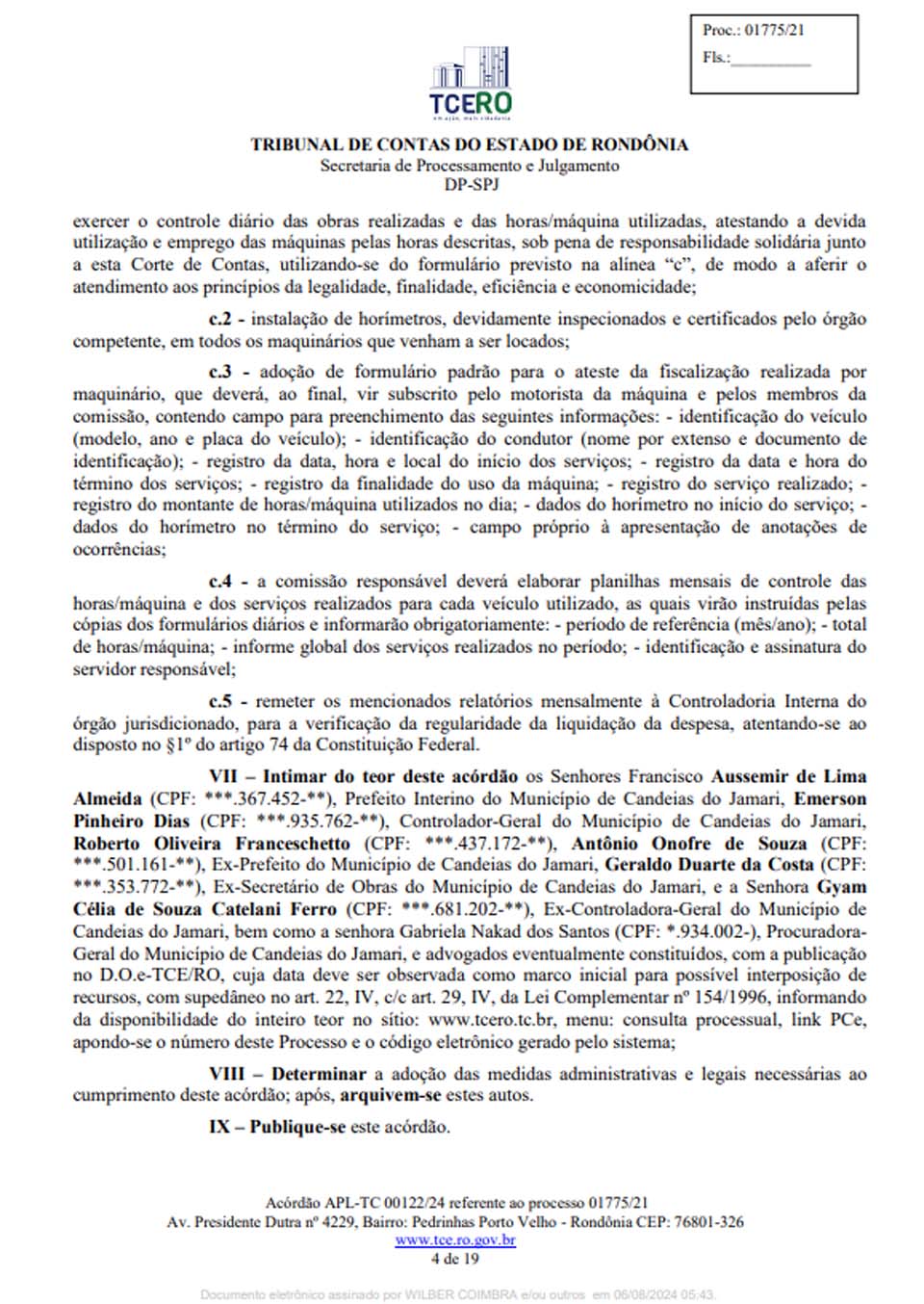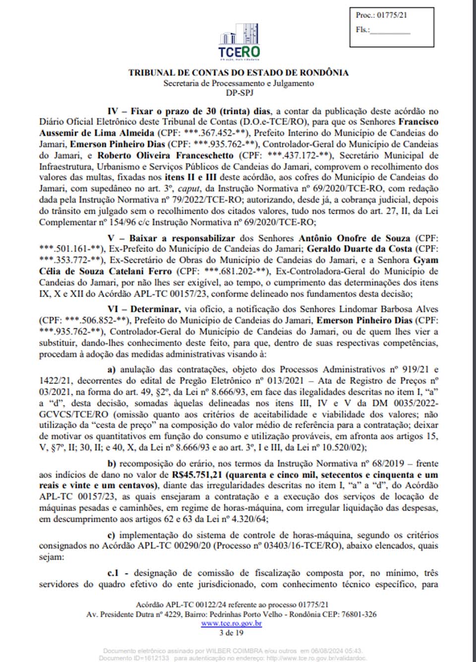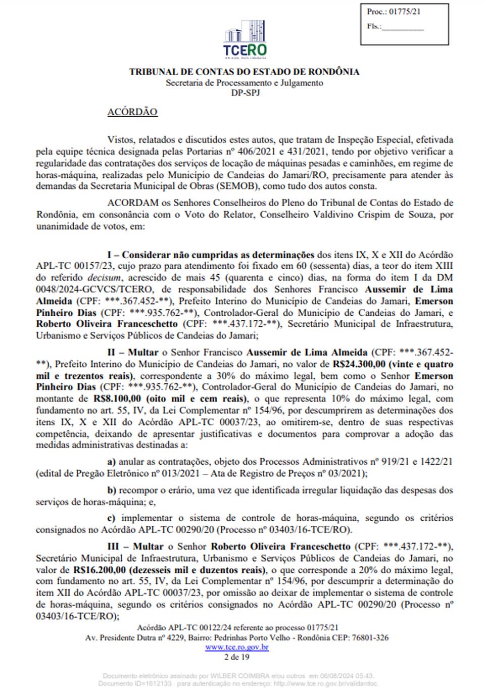 Francisco Aussemir de Lima Almeida, prefeito interino de Candeias do Jamari, já substituído por Lindomar Barbosa Alves, o Garçon, do Republicanos, foi multado em R$ 24.300,00, equivalente a 30% do máximo legal. Emerson Pinheiro Dias, controlador-geral do município, recebeu uma multa de R$ 8.100,00, correspondendo a 10% do máximo legal. Roberto Oliveira Franceschetto, secretário municipal de Infraestrutura, Urbanismo e Serviços Públicos, foi multado em R$ 16.200,00, o que representa 20% do máximo legal. As penalidades foram aplicadas por descumprimento das determinações de anulação dos contratos, recomposição do erário e implementação do sistema de controle de horas-máquina.