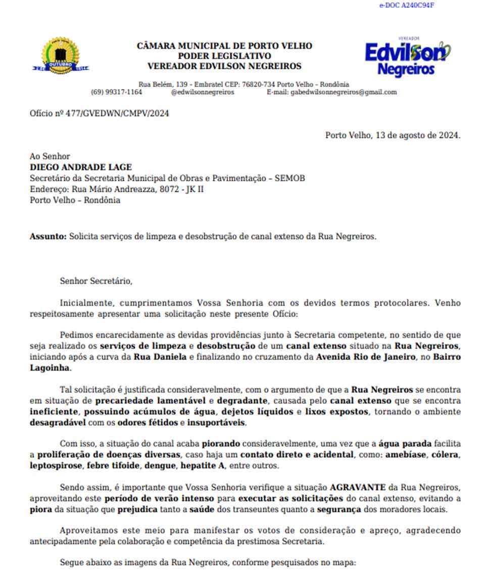 Porto Velho, RO – O vereador Edwilson Negreiros (PSDB) protocolou, no dia 13 de agosto de 2024, um ofício junto à Secretaria Municipal de Obras e Pavimentação (SEMOB) solicitando a realização de serviços de limpeza e desobstrução de um canal extenso localizado na Rua Negreiros, no Bairro Lagoinha, em Porto Velho. A solicitação destaca a urgência em resolver uma situação de precariedade que tem afetado a qualidade de vida dos moradores da região.