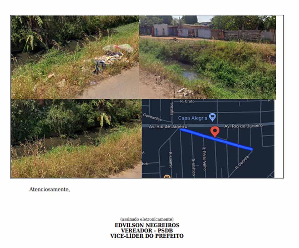 O ofício enfatiza a importância de aproveitar o período de estiagem para realizar os trabalhos de limpeza, prevenindo assim uma deterioração ainda maior das condições de saúde e segurança dos moradores locais. O pedido inclui imagens que ilustram o estado atual do canal e um mapa indicando a área afetada.
