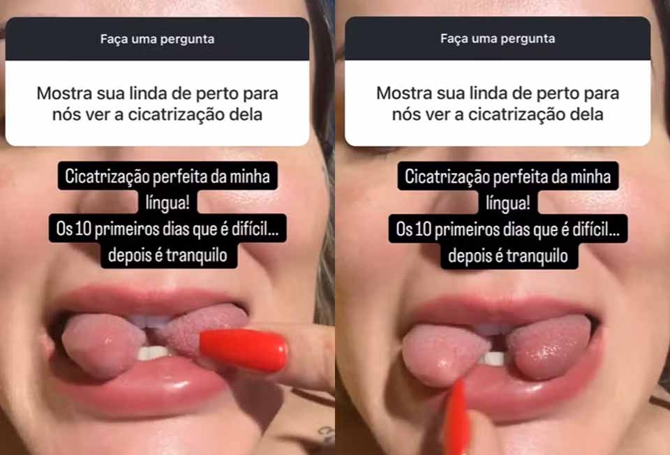 “Mostra sua língua de perto para vermos a cicatrização dela”, escreveu um seguidor. “Cicatrização perfeita da minha língua. Nos dez primeiros dias que é difícil, depois é tranquilo”, afirmou a loira, exibindo o órgão sem pontos ou cicatrizes.