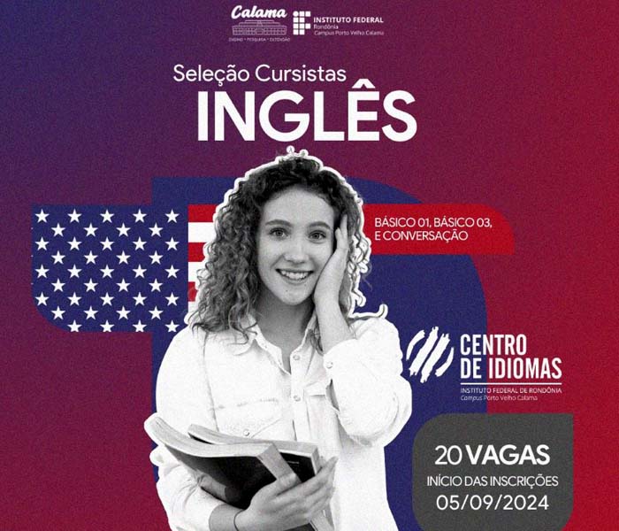 Estarão abertas no período de 05 a 07 de setembro as inscrições para os Cursos de Inglês Básico1, Básico 3 e Conversação, por meio do Centro de Idiomas do Instituto Federal de Educação, Ciência e Tecnologia de Rondônia (IFRO), Campus Porto Velho Calama.