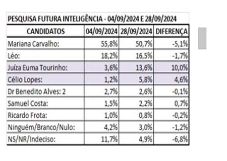 A nova pesquisa divulgada neste sábado (29) mostra claramente que Porto Velho terá segundo turno, pois a candidata com maior intenção de votos, Mariana Carvalho, estaria com apenas 45,4%; portanto, muito abaixo dos 50% + 1 da votação necessária que a consagraria como prefeita já no primeiro turno.