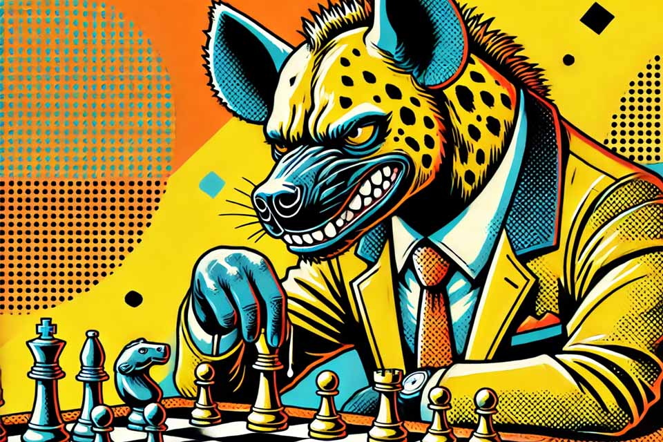 A hiena é um animal típico da África e da Ásia, possui andar esquisito, tem garras e dentes afiados, feio e perigoso, só anda em magote, caçadores eficientes, suas gargalhadas são para demonstrar sua hierarquia no grupo e grande parte da alimentação é à base de carcaças que encontram ou que roubam de outros carnívoros. Tal descrição serve para comparar alguns personagens políticos quando se juntam em magote para sabotar, derreter ou barrar o crescimento de um político. No jogo do poder, a hiena defende "Deus, pátria e família", se veste bem, gosta de roupas e sapatos com etiquetas de marcas, frequenta bons restaurantes, ocupa cargos e adoram receber diárias. Na África, as hienas caçam sua comida ou devoram as sobras, por aqui se reúnem em gabinetes e fazem churrasco quase toda semana regado a cerveja e vinhos caros. Além disso, infestam os espaços de poder e de tomada de decisões, levam tudo, ou seja, conquistaram carros de luxo, chácaras, apartamentos, fazendas, rebanhos bovinos, dinheiro e investimentos bancários, levando para si o sangue e o suor do povo para si. Neste caso, a comida preferida das hienas ocupantes dos espaços de poder e de tomadas de decisões é a carne de aliados ou futuros adversários. Além de serem bajuladores de primeira grandeza. Adoram gritar: “esse é o meu governador e nosso futuro senador!”.